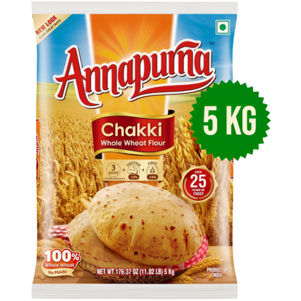 Annapurna Chakki Whole Wheat Atta Flour – 5 Kg is made from 100% whole wheat, carefully ground using the traditional chakki process to preserve the natural aroma, nutrition, and taste. Rich in fiber, vitamins, and essential nutrients, this atta makes soft, fluffy, and wholesome rotis that keep you energized throughout the day. Perfect for families looking for healthy, everyday nourishment.