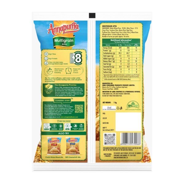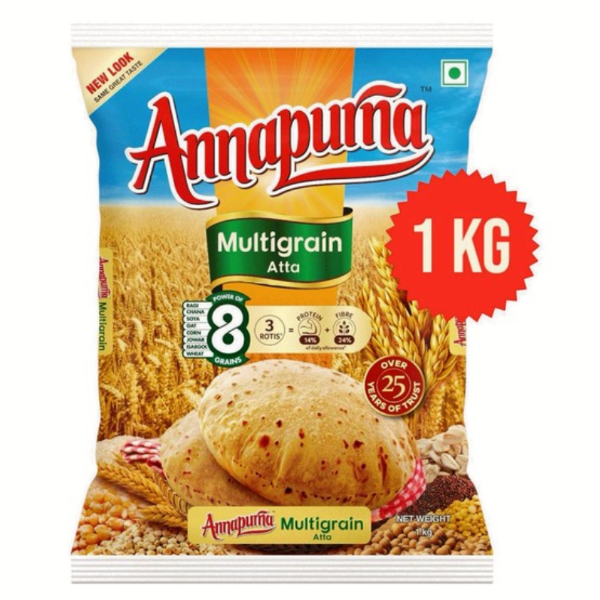 Annapurna Multigrain Atta Flour – 1 Kg brings together the wholesome goodness of carefully selected grains to give you a nutritious and balanced flour. A blend of wheat, maize, barley, oats, soya, and other grains, this flour is rich in dietary fiber, protein, and essential nutrients. It makes soft, fluffy rotis while supporting digestive health and sustained energy—perfect for everyday family meals.