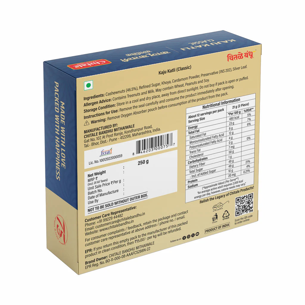 Delight in the timeless taste of Chitale Classic Kaju Katli, a signature Indian sweet made from premium-grade cashews and pure ghee. Known for its silky texture, rich nutty flavor, and perfect sweetness, this delicacy embodies purity and tradition. Freshly prepared under strict hygiene standards and carefully packed to preserve freshness, it’s an elegant choice for gifting, festive celebrations, or everyday indulgence.