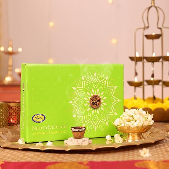 Cycle Pure Naivedya Gold Sambrani Dhoop Cups (Jasmine) – 1 Box (18 Pcs) blend the purifying essence of traditional sambrani with the sweet, soothing fragrance of jasmine flowers. These easy-to-use cups create a calming ambience that is ideal for puja, meditation, and relaxation, filling your space with a serene floral aroma.
