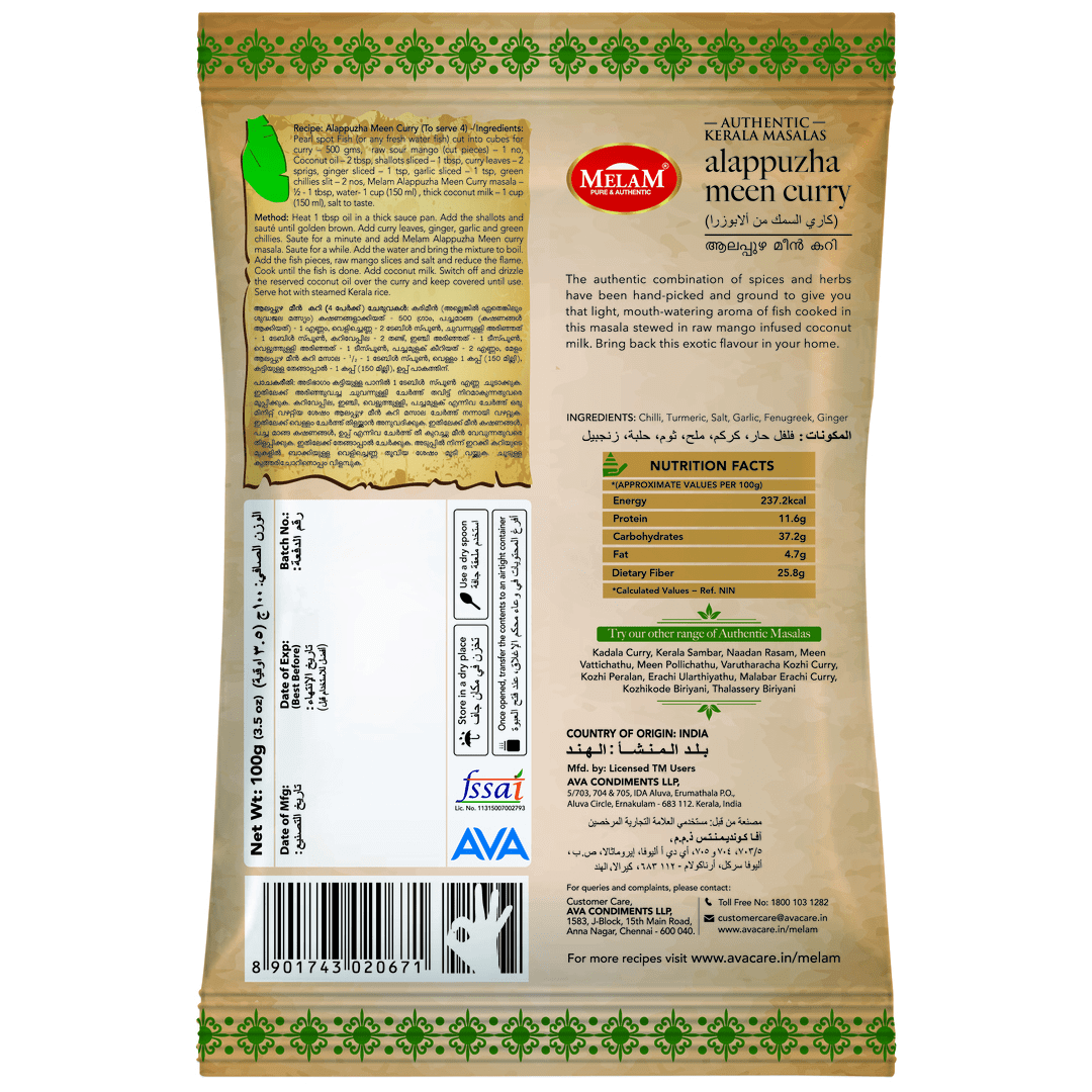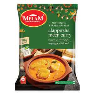 Melam Alappuzha Meen Curry Masala is a finely ground spice blend crafted specifically to recreate the authentic flavors of Alappuzha-style fish curry. This masala combines traditional spices known for their rich aroma and robust taste, making it perfect for preparing flavorful, spicy fish curries reminiscent of Kerala’s coastal cuisine.