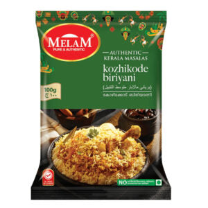 Melam Kozhikode Biriyani Masala is an authentic spice blend crafted to capture the unique flavors of Kozhikode (Calicut) biriyani. This masala combines aromatic spices that create a rich, flavorful, and fragrant biriyani experience, perfect for making traditional Kerala-style biriyani at home with ease.