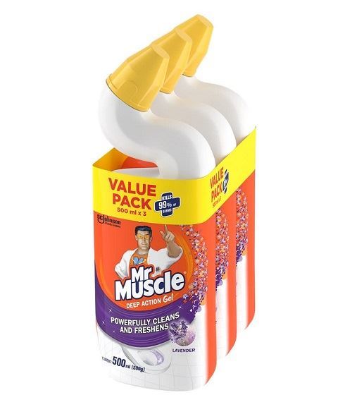 Mr Muscle Toilet Cleaner Lavender Triple Pack (3 × 500 ml) combines powerful cleaning action with a soothing lavender fragrance to keep your toilet fresh and hygienic. Its thick clinging formula removes tough stains, limescale, and bacteria while killing 99.9% of germs. Designed for deep cleaning, it leaves behind a long-lasting floral scent, ensuring a spotless and pleasant-smelling toilet every time—now available in a convenient triple pack.
